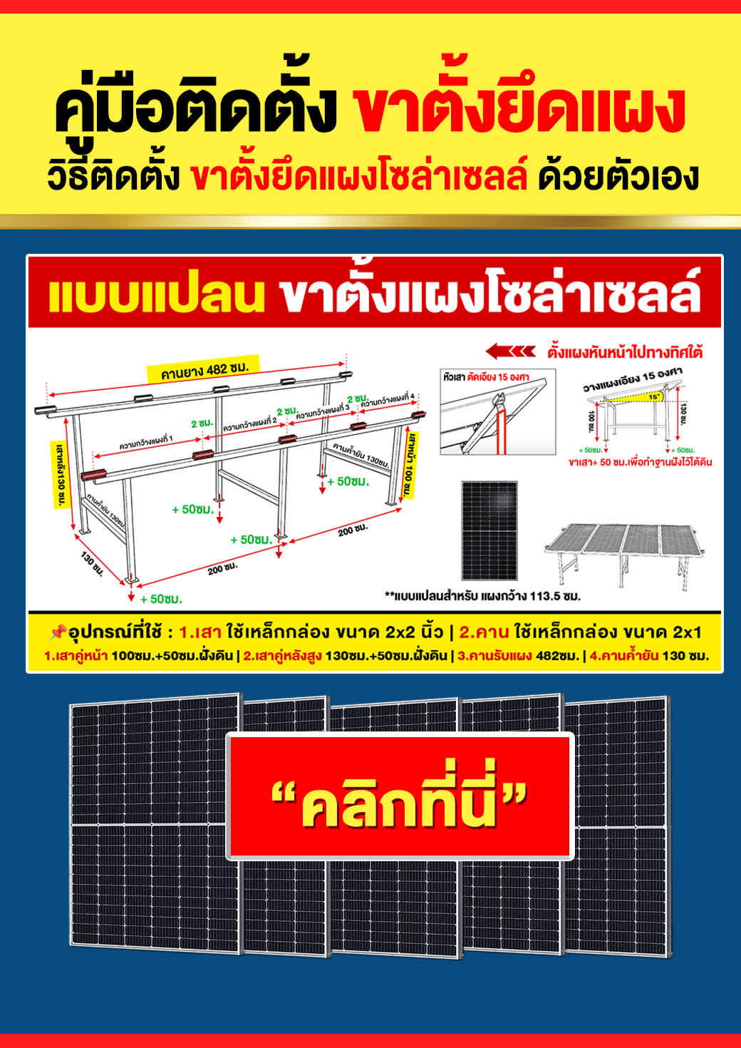 - ✅คานยึดแผง = ยาว 482ซม.(ขนาดคาน = ความกว้างแผง x จำนวนแผง +เผื่อระยะขอบด้านข้าง)