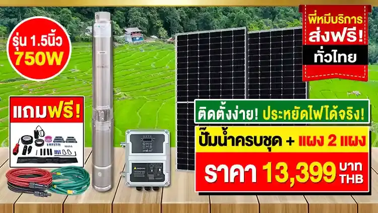 - สเปค ปั้มน้ำซับเมอร์ส รุ่น 1.5นิ้ว 1แรงม้า 750W | ใช้แผงโซล่าเซลล์ 2แผง