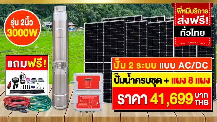 - สเปค ปั้มน้ำซับเมอร์ส 2 ระบบ AC/DC รุ่นใหญ่ 2นิ้ว 4แรงม้า 3000W | ใช้แผงโซล่าเซลล์ 8แผง